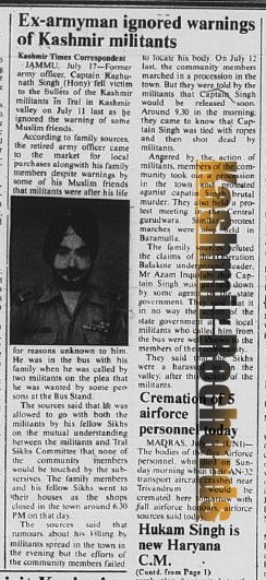 Newspaper clipping reporting the killing of Dr. Raj Nath, April 1990