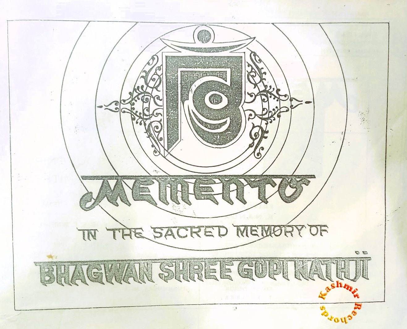 It was in mid 1974 when a rare souvenir was published by K Nanda, Editor from Birla Nagar, Gwalior Madhya Pradesh in memory of Bhagwan Gopi Nath Ji of Kashmir. Kashmir Rechords has managed to get a photocopy of this memento.