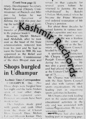Mr Chopra eventually returned to Jammu after intervention by Bakshi Ghulam Mohammad, who ordered the restoration of his pension and rehabilitation.For nearly three decades thereafter, he remained deeply involved in Jammu’s civic life.