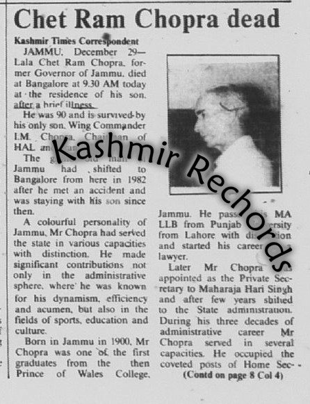Yet archival records and contemporary reports dug up by Kashmir Rechords portray Mr Chopra as a multi-dimensional personality — an able lawyer, a tough administrator, a sportsman, a public intellectual and a devoted patriot.