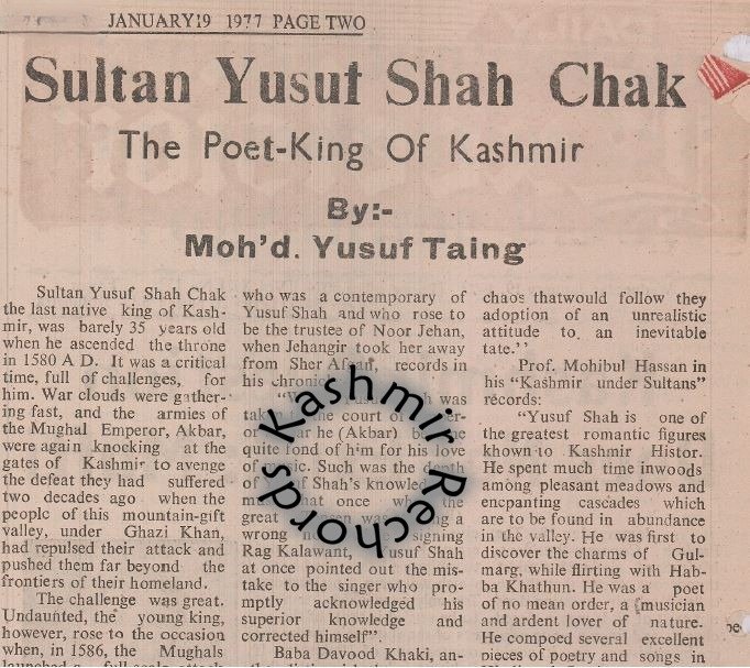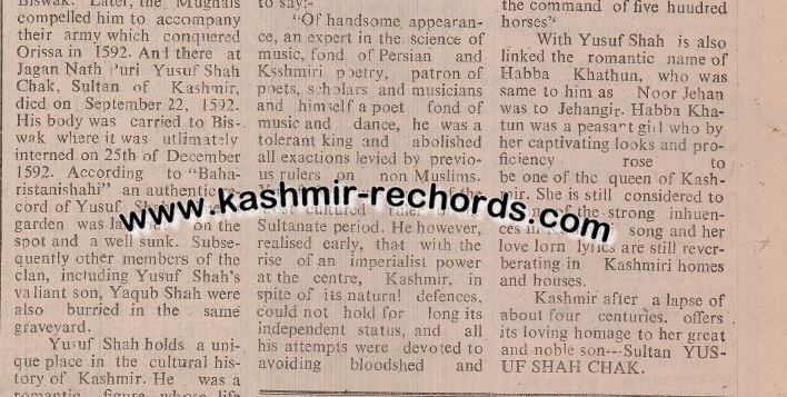 Adding another twist, Kashmir Rechords has unearthed a valuable document — a detailed article written in January 1977 by Mohammad Yousuf Taing, former Secretary of the J&K Cultural Academy. Taing, who had himself visited Biswak decades earlier, confirmed that the grave of Habba Khatoon was indeed found beside that of Yousuf Shah Chak, along with the grave of his son.