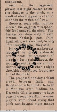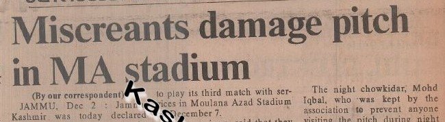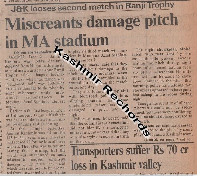 Newspaper reports preserved by Kashmir Rechords from December 1990 suggest that the pitch at M. A. Stadium Jammu was allegedly damaged to avoid an impending defeat against Haryana. The move, however, backfired, leading to the match being awarded to Haryana and further damaging Kashmir’s cricketing reputation.