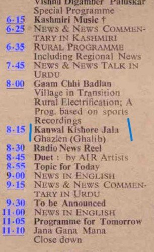 Dr. Rafeeq Masoodi, a noted broadcaster and former Secretary of J&K Cultural Academy, recalls Jalla’s mesmerizing presence at Radio Kashmir, Srinagar. His recollections take us back to a golden evening in 1986 when legends Bhajan Sopori, Vijay Malla and Ghulam Nabi Sheikh gathered in Studio-06 for a composition. Among them stood Kanwal Kishore Jalla—his appearance a striking resemblance to Dev Anand, dressed in a tight yellow trouser, crisp shirt and a knotted tie. But it wasn’t just his flamboyant presence that captivated; it was his voice—soft, velvety, reminiscent of the great Talat Mahmood.