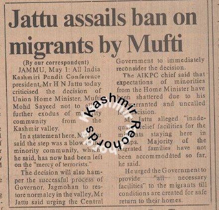 During his two-day visit to Jammu, Mufti Mohammad Sayeed  had instructed the then Jammu and Kashmir administration to prevent any further migration of Kashmiri Pandits with immediate effect. The directive was unambiguous: the exodus from Kashmir had to stop.