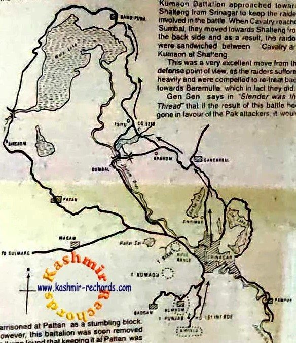 On November 4, 1947, under a well strategic plan, the raiders were allowed to move up to Shalteng crossing, where they were s attacked. Cavalry—a part of Infantry Brigade was rushed to Sumbal area via Ganderbal in order to attack the Pakistani soldiers from the back side. They were joined by Kummon battalion at Shalteng. Thus, the enemy forces, sandwiched between cavalry and Kummon, suffered heavily and their dreams of capturing Srinagar were shattered. Hundreds of Pathans and tribes- men were killed in the battle, while the remaining fled back after leaving Lorries, arms and ammunition at Shalteng.