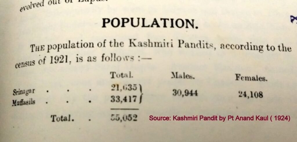 In 1921, the Jammu and Kashmir State Census recorded 55,052 Kashmiri Pandits residing in the Valley, as noted in Pt. Anand Kaul’s 1924 book Kashmiri Pandits. Of this number, 21,635 lived in Srinagar, while 33,417 were spread across rural areas. Despite their modest population, they maintained a healthy sex ratio with 30,944 males and 24,108 females. Far from the “elite ruling class” narrative, only seven Pandits held gazetted positions in Government jobs at that time!