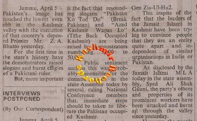 In April 1979, when Pakistan’s former Prime Minister Zulfikar Ali Bhutto was executed, demonstrations erupted in Kashmir condemning Pakistan’s military ruler General Zia-ul-Haq, with protesters shouting the slogan “Zia Koon”—the one-eyed Zia……“ Pakistan Murdabad.