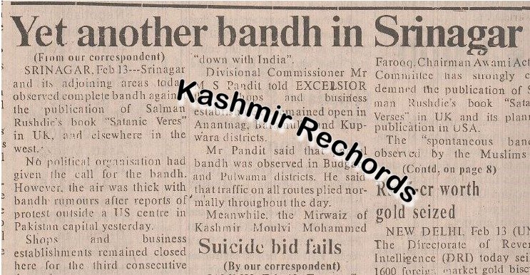 The publication of The Satanic Verses led to massive protests on February 13, 1989 in Srinagar. Clashes with police left one person dead and over 100 injured, while minority religious sites were damaged.