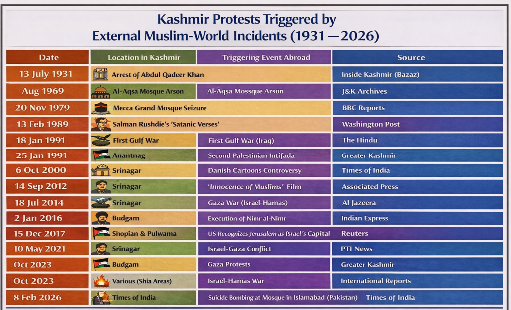 For decades, events unfolding thousands of miles away—in Palestine, Iran, Iraq, Saudi Arabia, Pakistan and even Europe—have periodically triggered protests in Kashmir. These demonstrations are often articulated in the language of “Islamic solidarity and global Muslim identity”, but their consequences have frequently been intensely local.